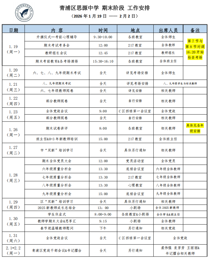 2025学年第一学期第十七周工作安排